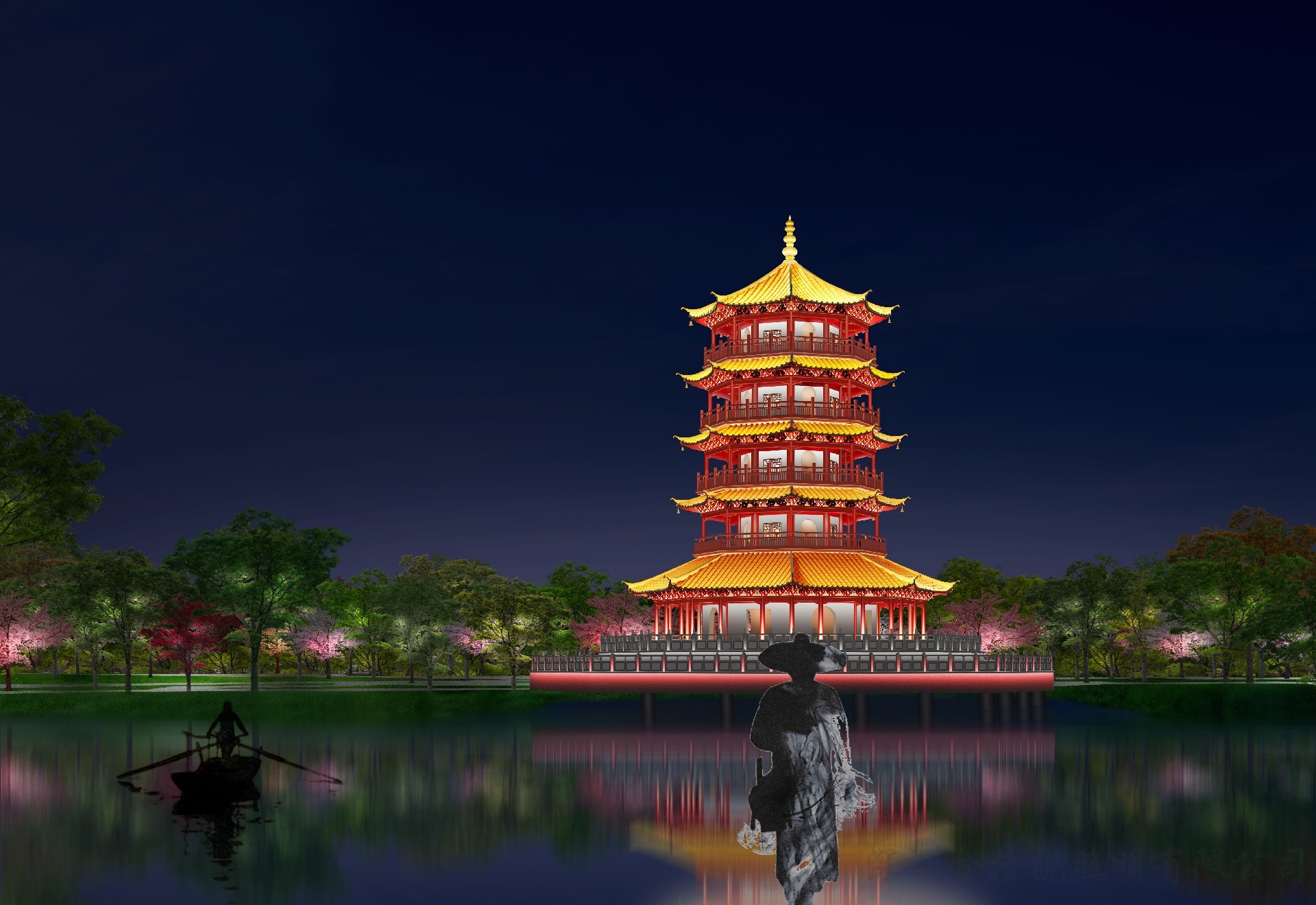 采用影视化的舞台背景塑造武侠 剧情演绎,将塔的平常模式、节 日模式、深夜模式分别展现受众 眼前,预留配合后期舞台的演绎 舞台灯光效果。展现平乐塔的多 种模式画面。